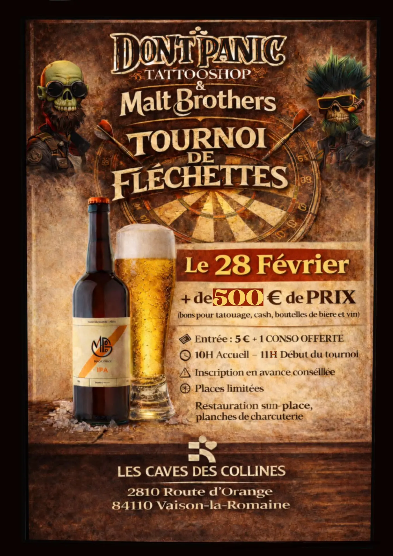 Ein Dartturnier für alle mit Preisen im Wert von über 500€: Tattoo-Gutscheine, Bargeld, Bier- und Weinflaschen. Gesellige Atmosphäre, Wettkampfgeist und Spaß sind garantiert. Eine Anmeldung wird empfohlen! Verpflegung vor Ort, Wurstbretter.