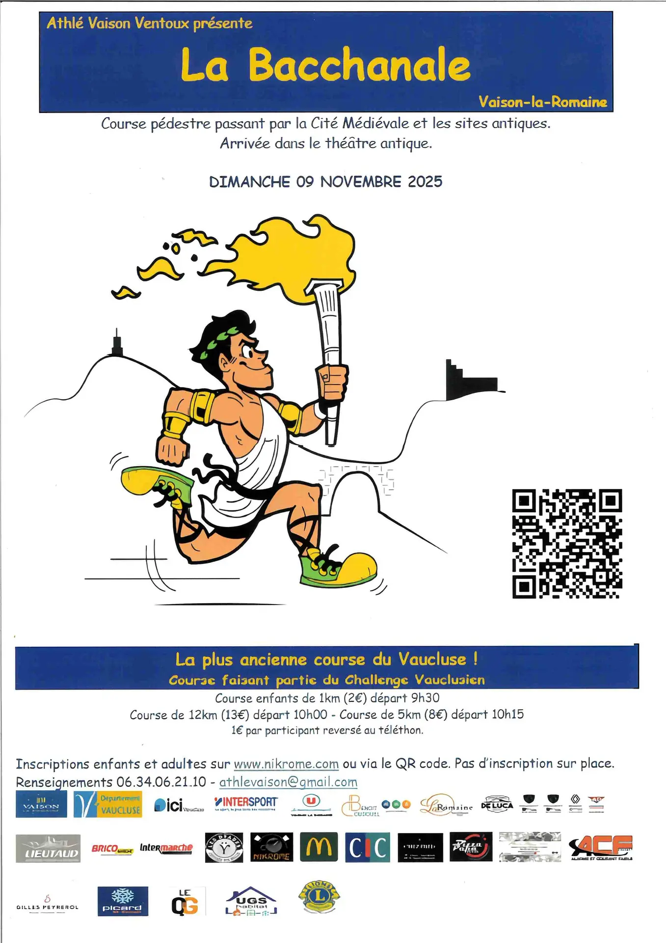 Der Athlé Vaison Ventoux organisiert den ältesten Fußlauf im Vaucluse mit dem Bacchanale und seinen 3 freien Läufen über eine Distanz von 11,950 km und 5 km für Erwachsene und 1 km für Kinder (Online-Anmeldung - keine Anmeldung vor Ort).