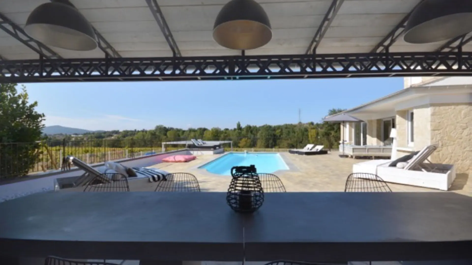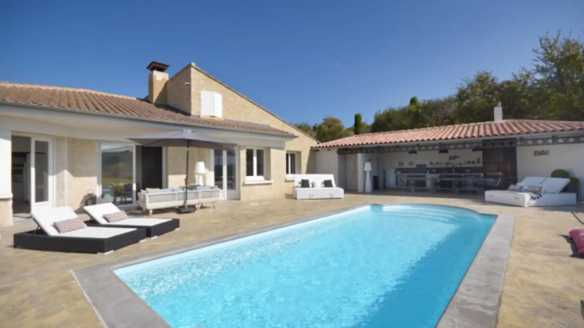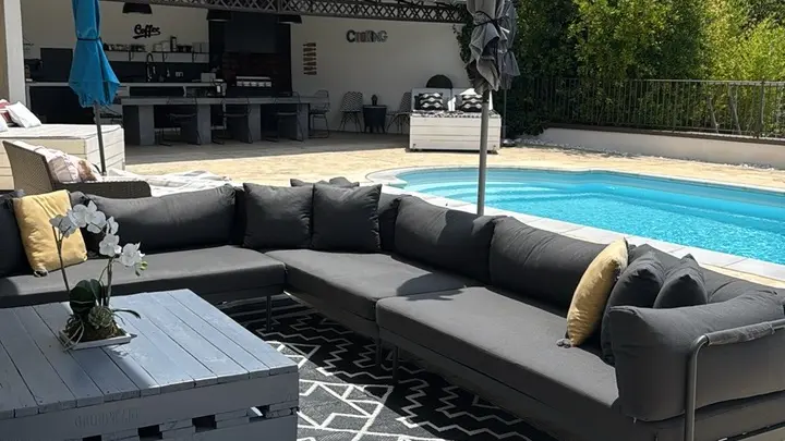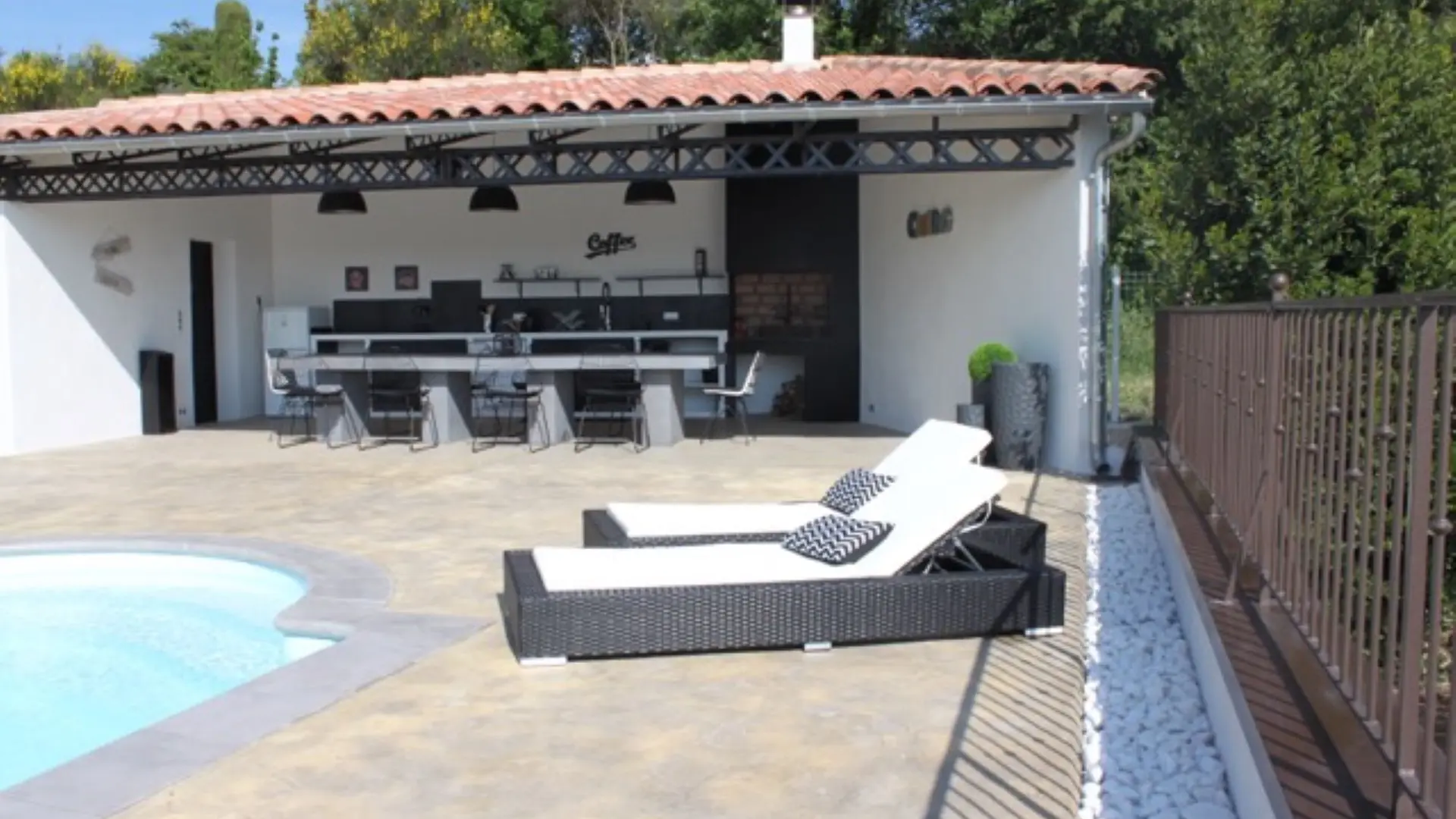 Eine große Terrasse von 150 m² im Süden führt zu einem sehr angenehmen Poolbereich mit einer Sommerküche, einer Plancha und Tischtennis.