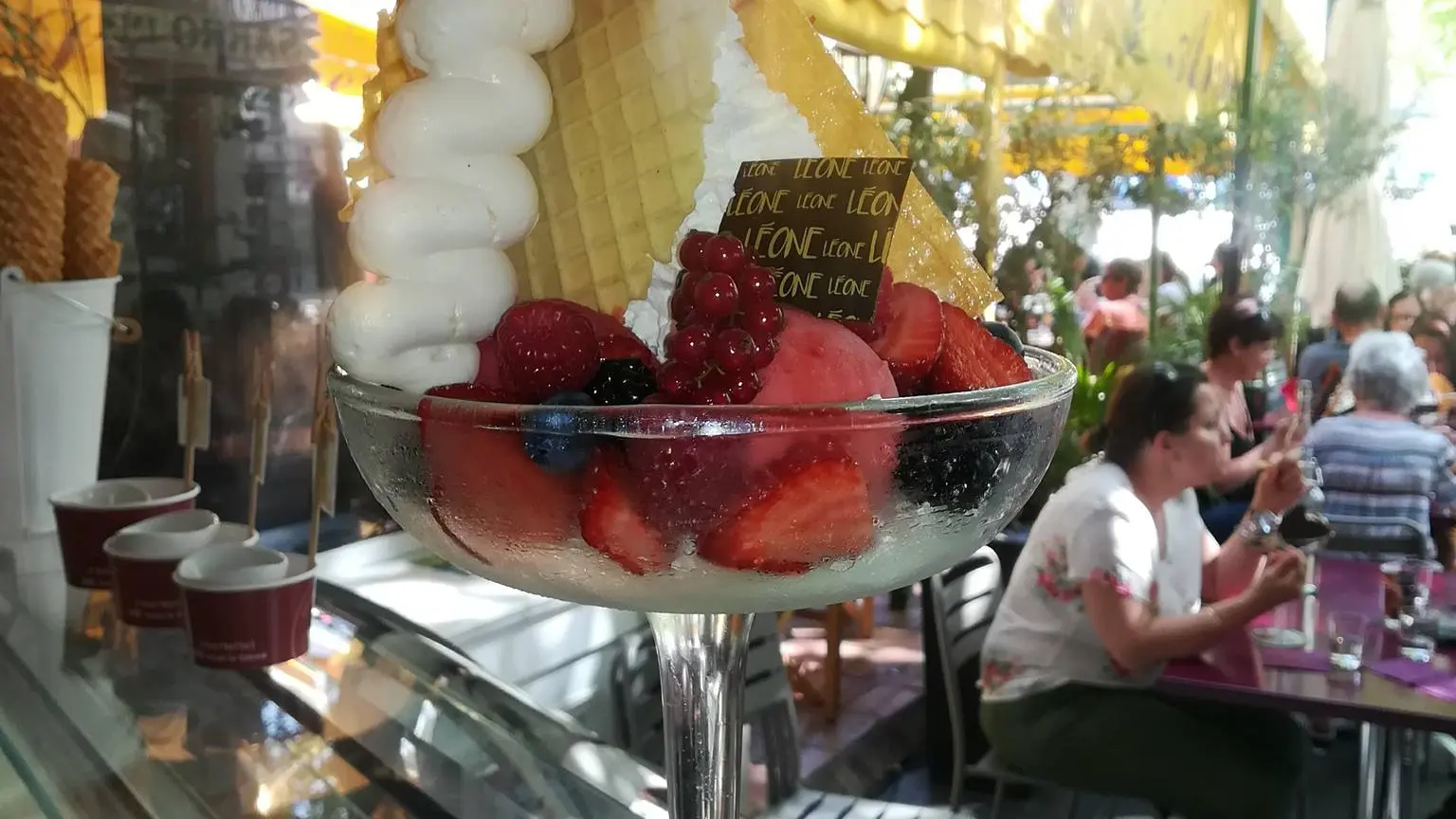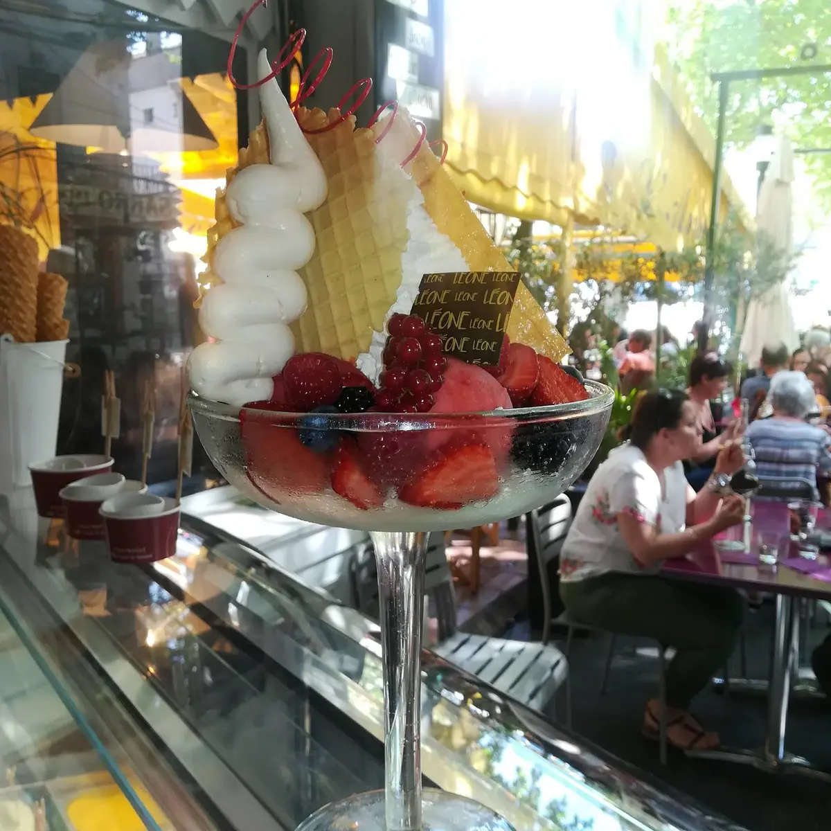 "Léone Terrasse", die ausschließlich dem Service der Eisbecher und dem Verkauf von Cornets und kleinen Gläsern zum Mitnehmen gewidmet ist.
