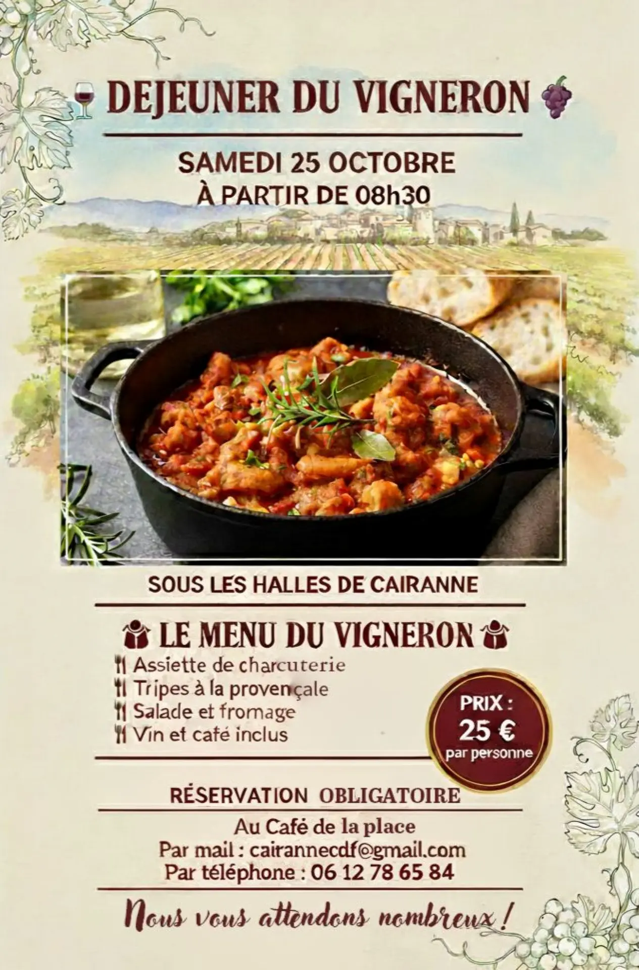 Auf dem Menü stehen ein Aufschnittteller, Kutteln à al provençale, Salat und Käse, Wein und Kaffee inklusive.