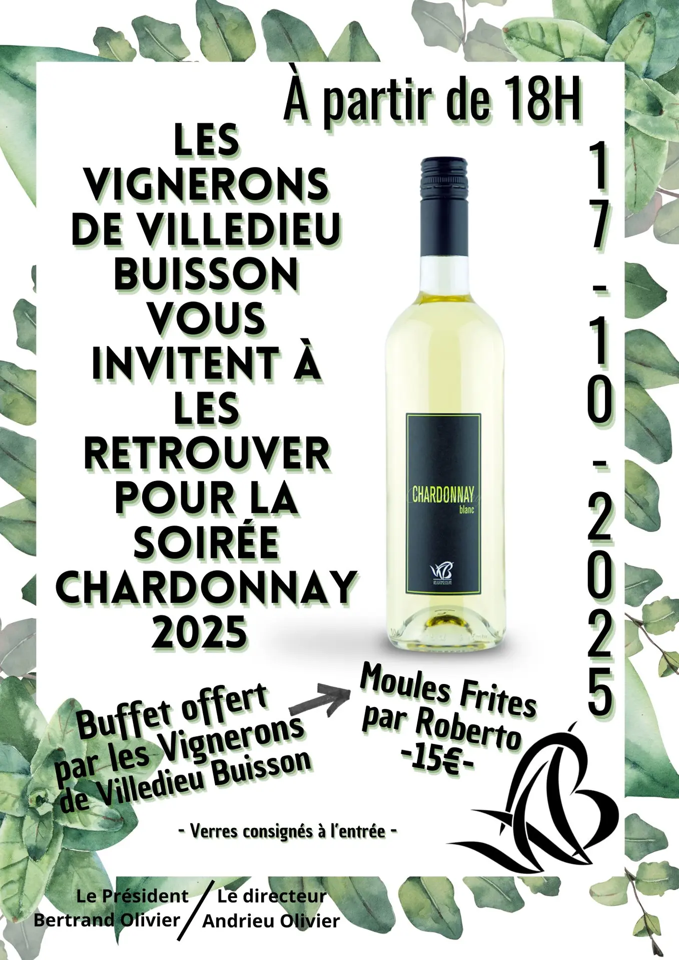 Die Winzer der Weinkellerei Villedieu - Buisson laden Sie ein, sie bei einem Chardonnay-Abend zu treffen. Buffet, das von den Winzern angeboten wird. Essensmöglichkeit vor Ort: Moules frites von Roberto für 15 Euro. (Die Gläser werden am Eingang mit Pfand belegt).