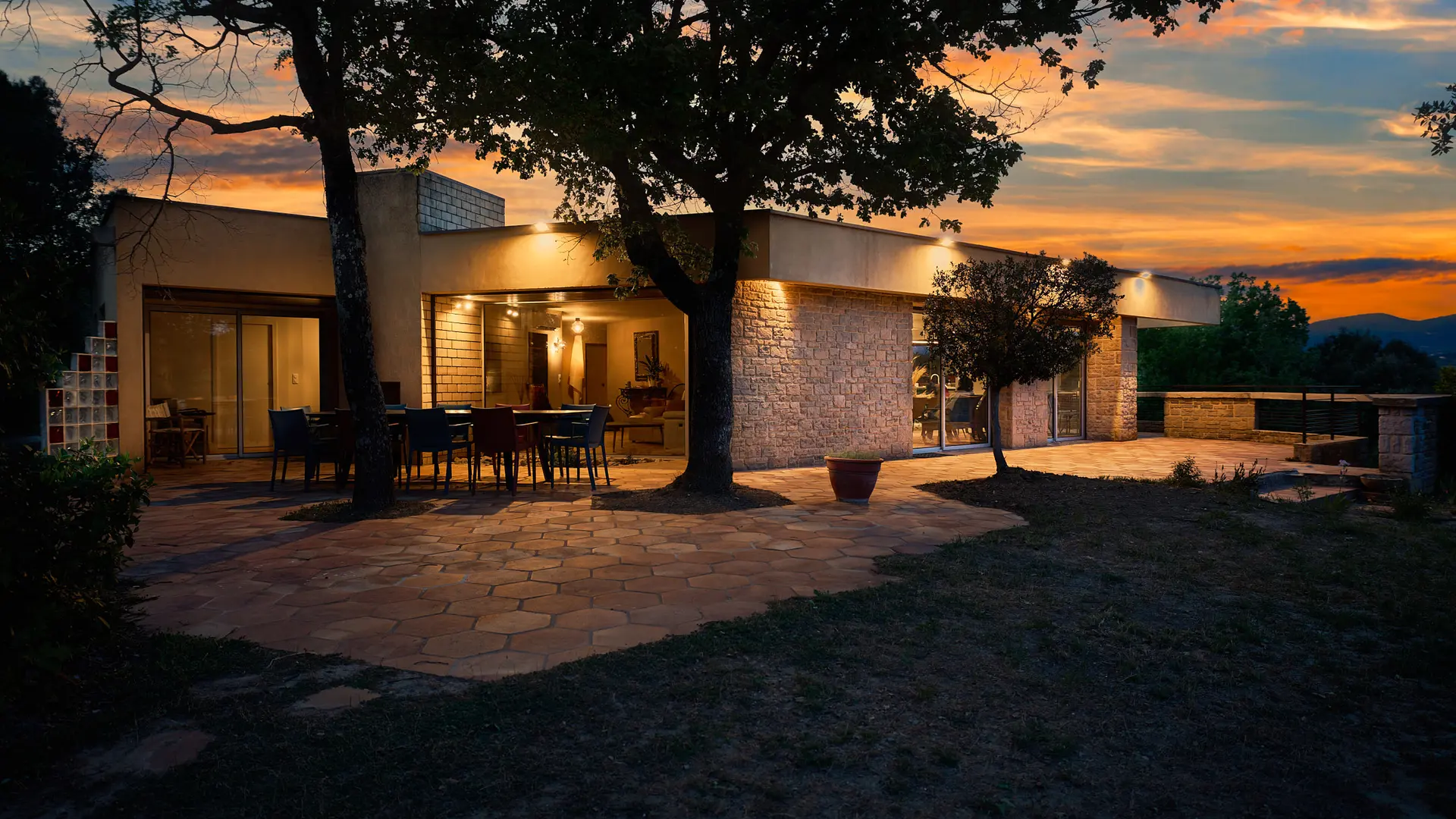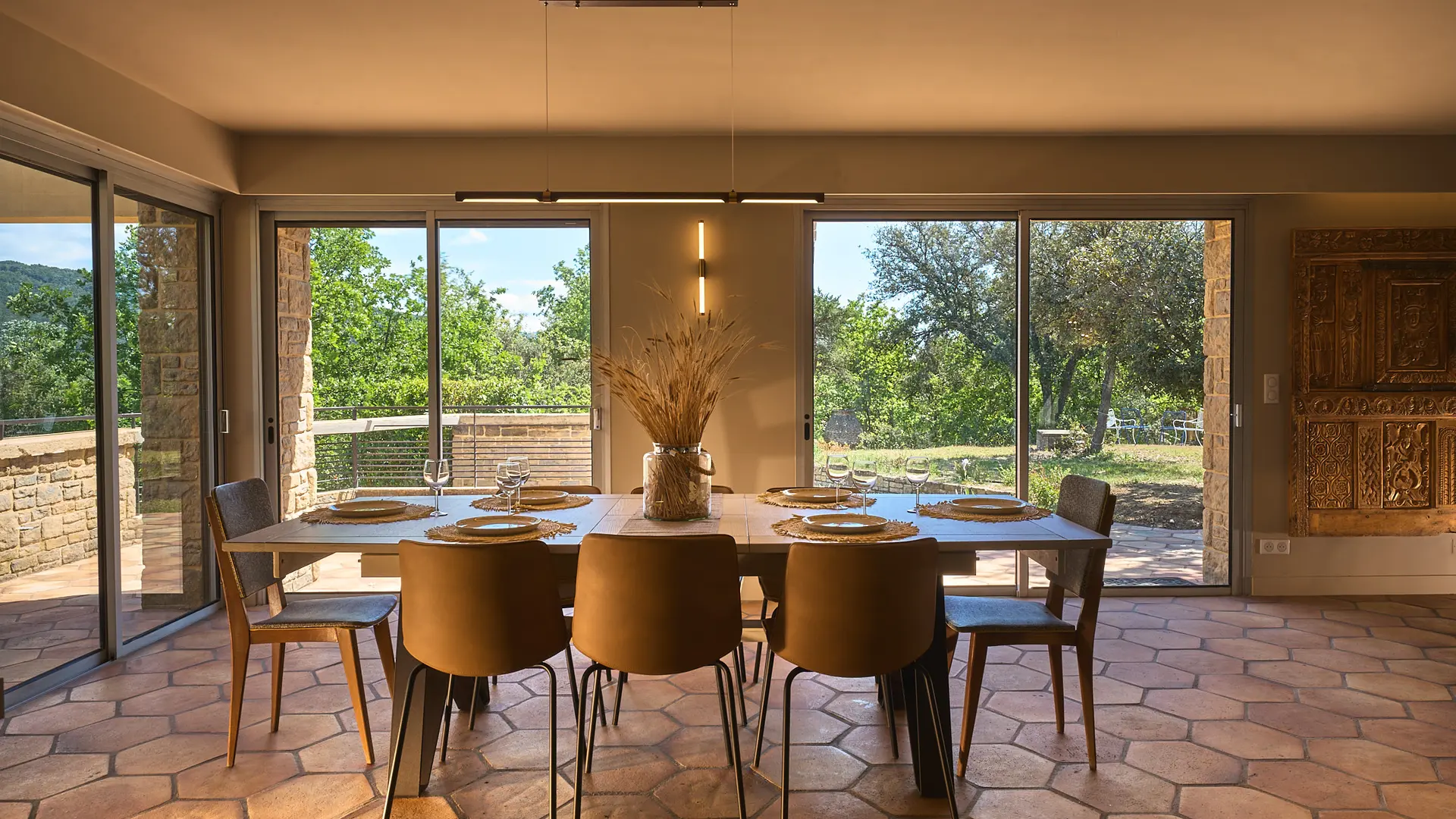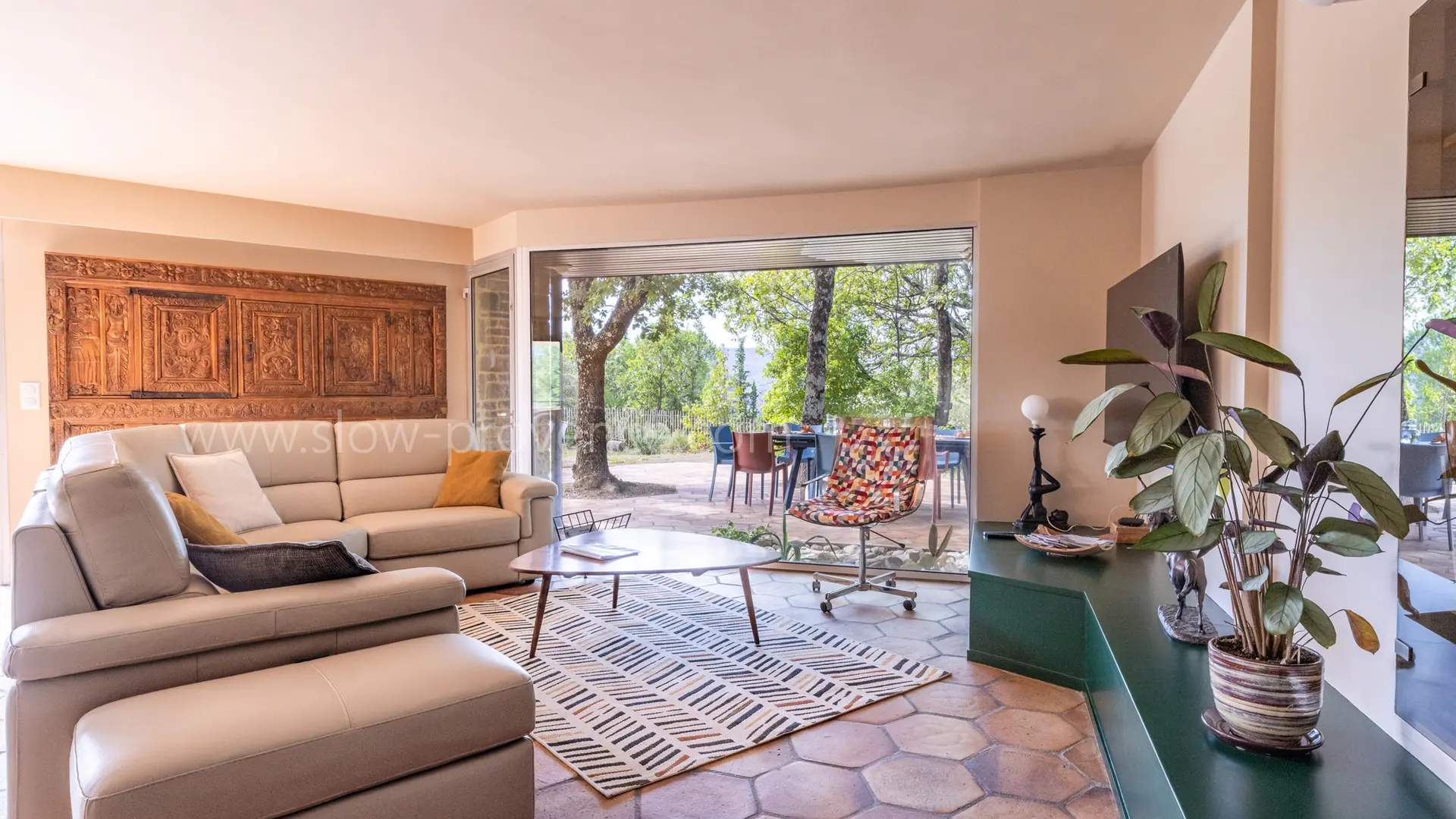 Der Haupteingang des Hauses führt in einen 90m² großen, lichtdurchfluteten Wohnbereich mit Fensterfronten rund um das Haus, der nach Süden ausgerichtet ist und Zugang zu Terrasse, Garten und Pool bietet. Dieser große Raum besteht aus einem Wohnzimmer, einem Esszimmer und einer geräumigen offenen Küche mit einer zentralen Insel. Ob der Panoramablick auf die Baronnies von der Küchenterrasse aus, der Garten mit Bäumen auf der Südseite, der exotische Innenhof auf der Westseite oder der Blick auf das Schloss und das antike Theater von Vaison la Romaine vom Pool aus - diese Villa liegt mitten in der provenzalischen Vegetation und hat keine Gegenüber. Auf dieser Ebene finden Sie auch 3 Schlafzimmer: