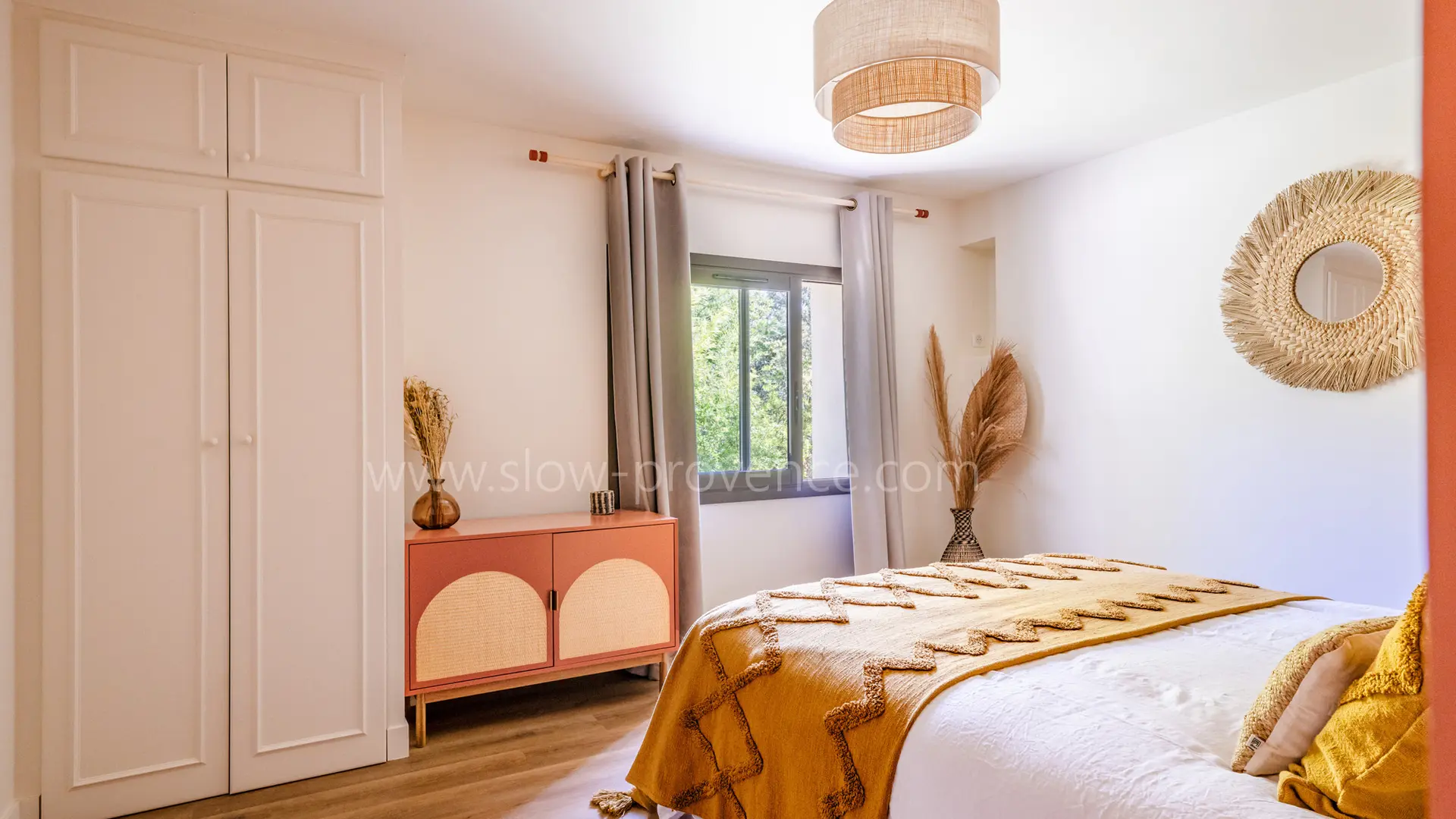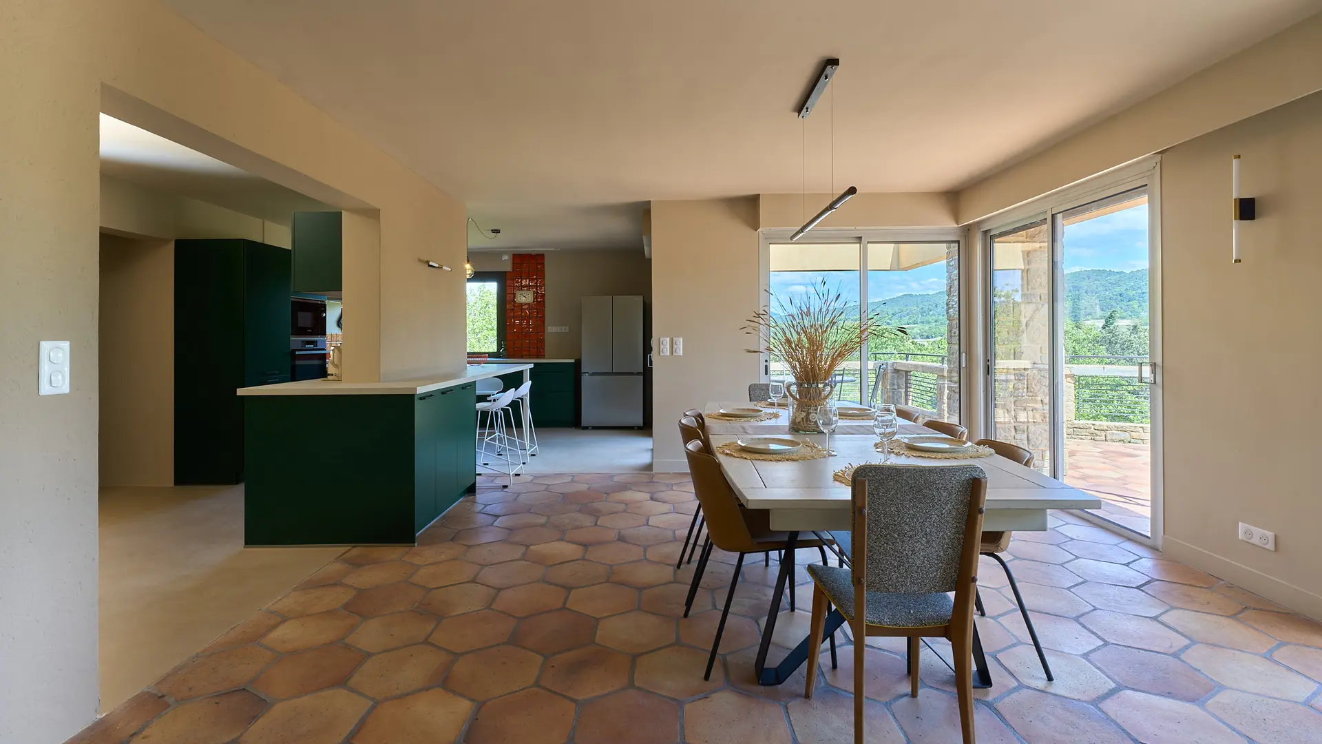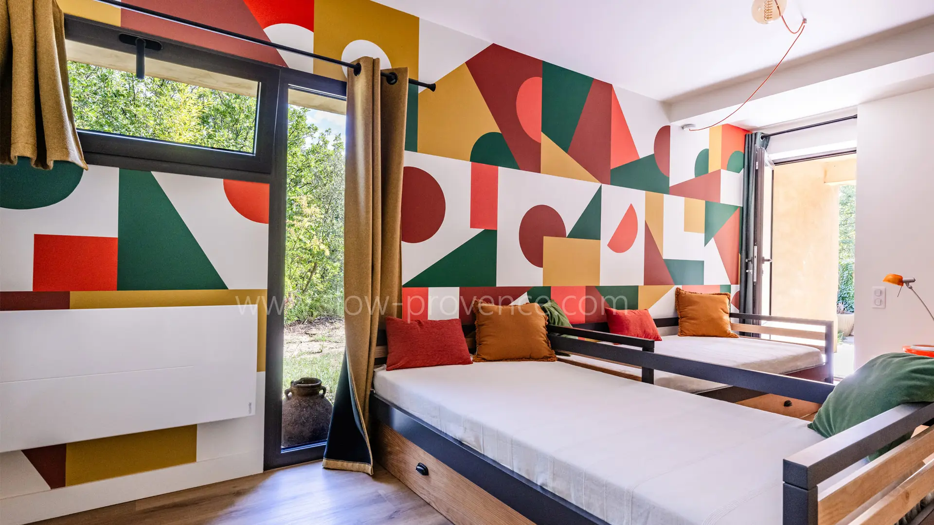 Der Haupteingang des Hauses führt in einen 90m² großen, lichtdurchfluteten Wohnbereich mit Fensterfronten rund um das Haus, der nach Süden ausgerichtet ist und Zugang zu Terrasse, Garten und Pool bietet. Dieser große Raum besteht aus einem Wohnzimmer, einem Esszimmer und einer geräumigen offenen Küche mit einer zentralen Insel. Ob der Panoramablick auf die Baronnies von der Küchenterrasse aus, der Garten mit Bäumen auf der Südseite, der exotische Innenhof auf der Westseite oder der Blick auf das Schloss und das antike Theater von Vaison la Romaine vom Pool aus - diese Villa liegt mitten in der provenzalischen Vegetation und hat keine Gegenüber. Auf dieser Ebene finden Sie auch 3 Schlafzimmer: