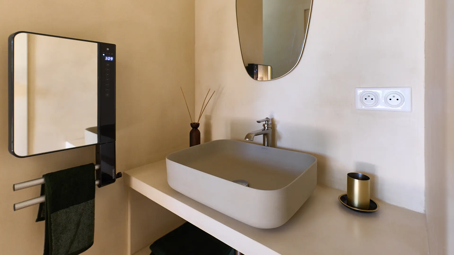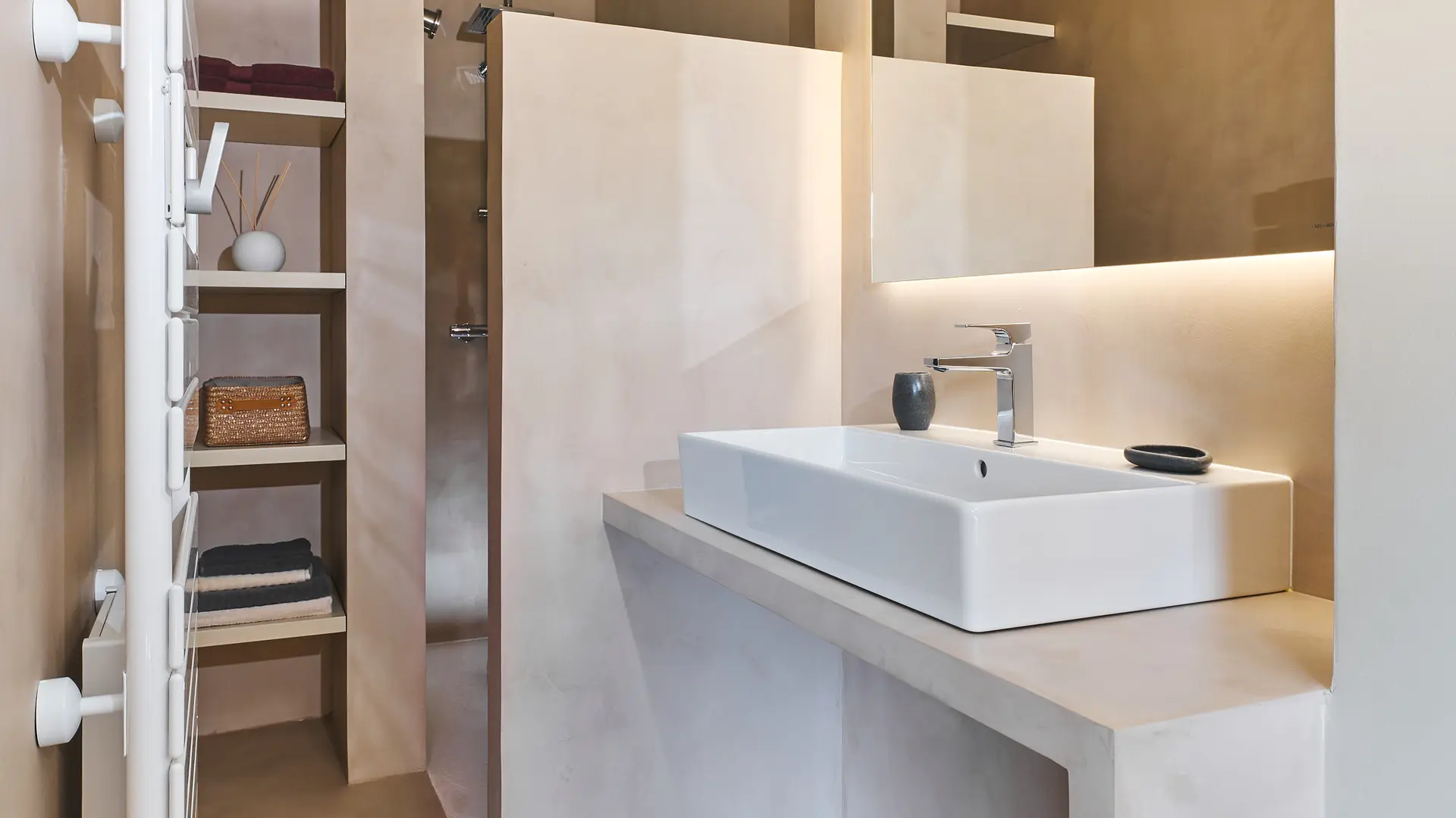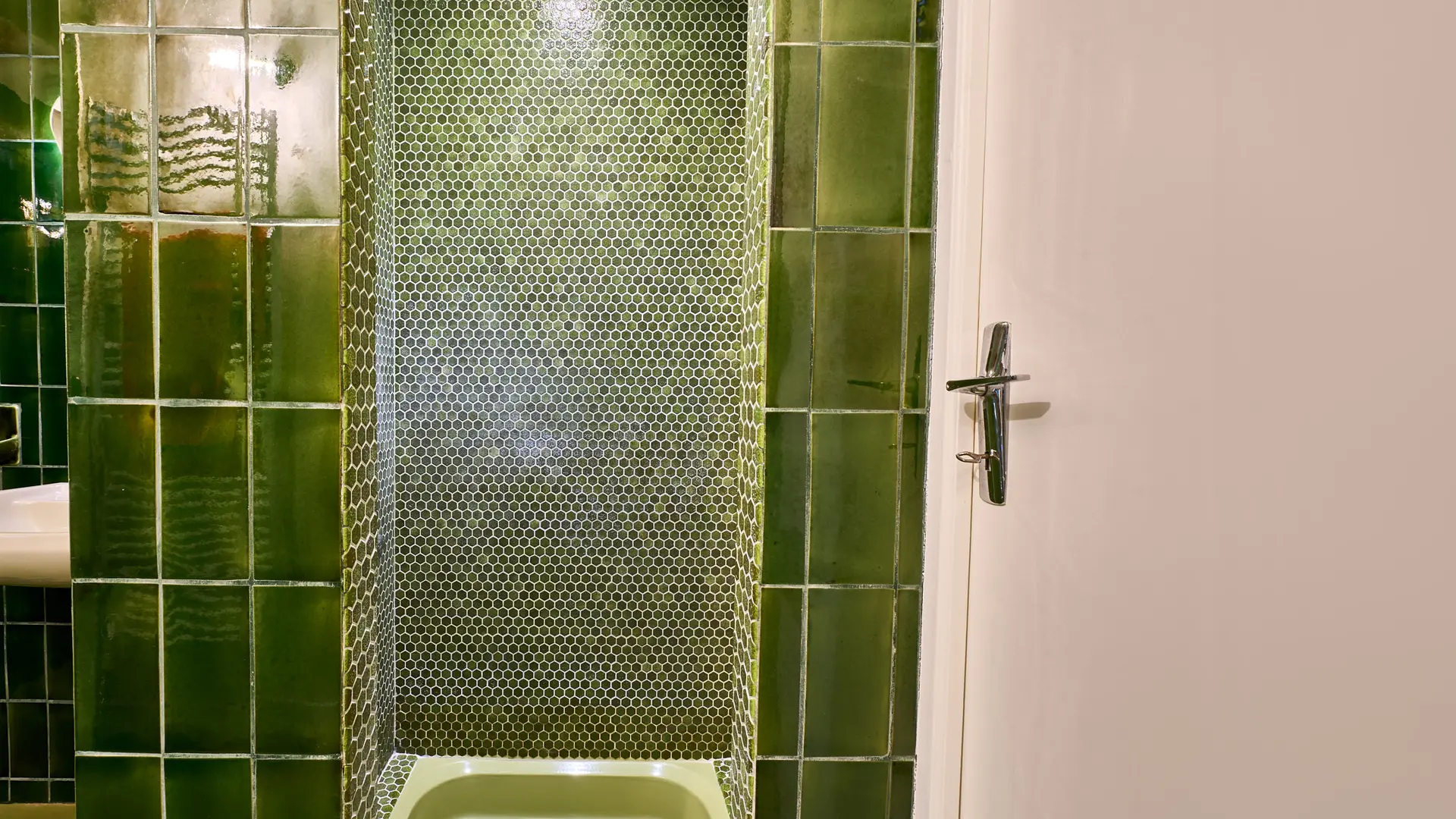 Privates Badezimmer mit begehbarer Dusche und Waschbecken. Ein einzigartiges Design, das in den 70er Jahren erhalten geblieben ist... Vintage-Liebhaber aufgepasst!