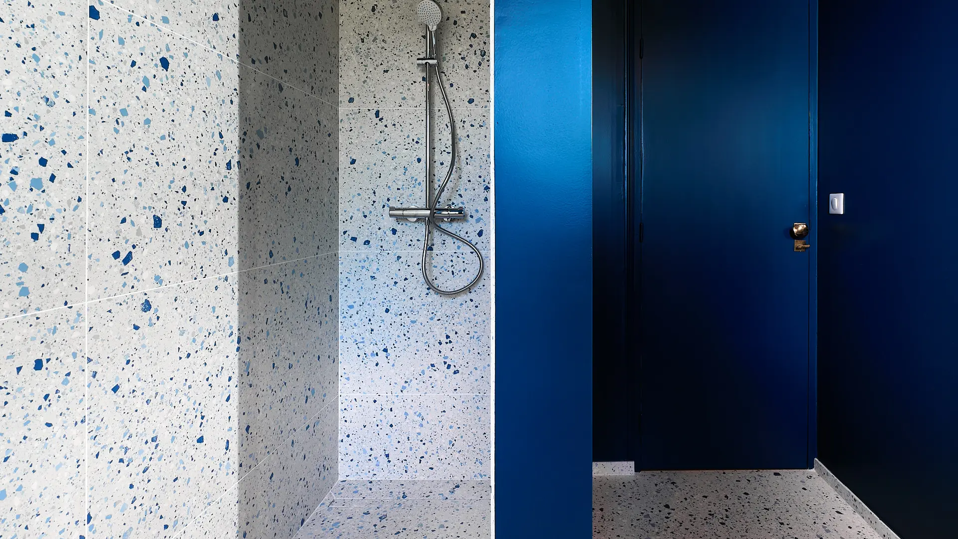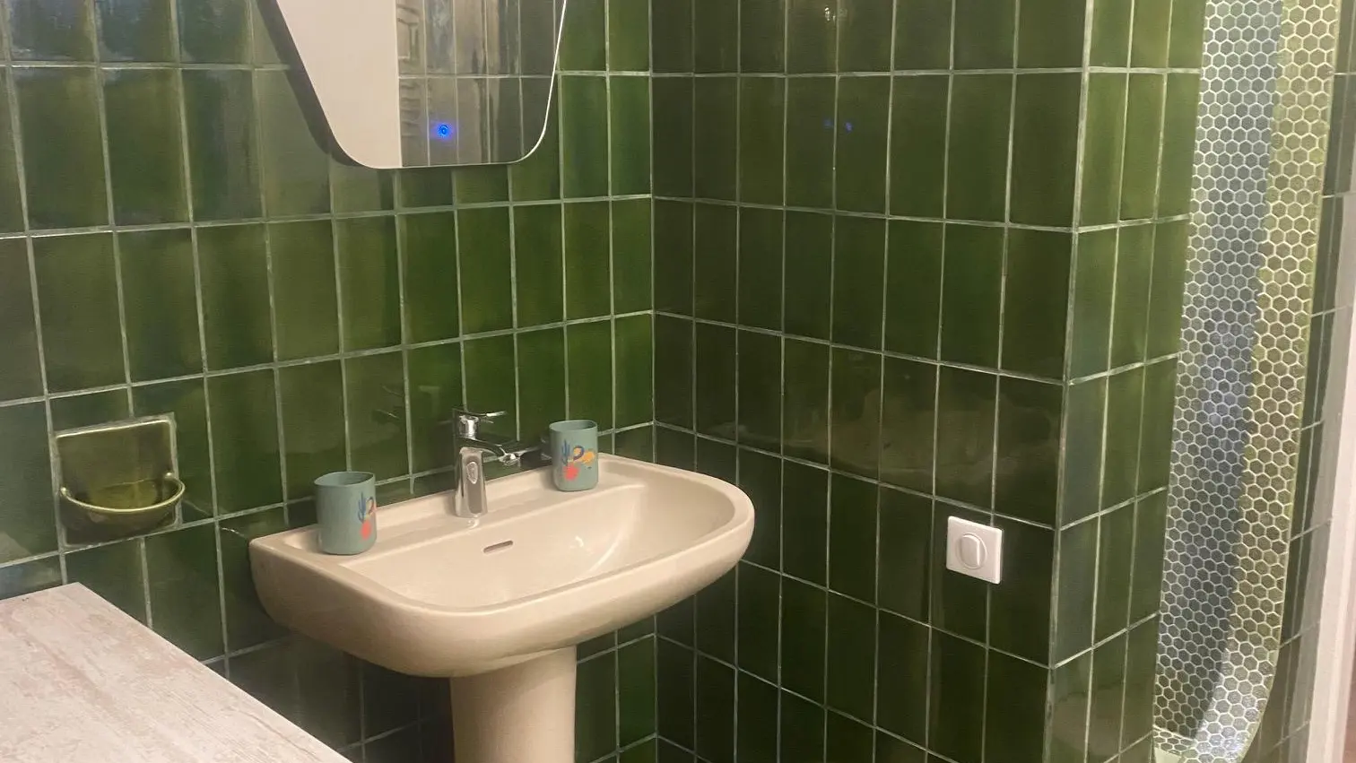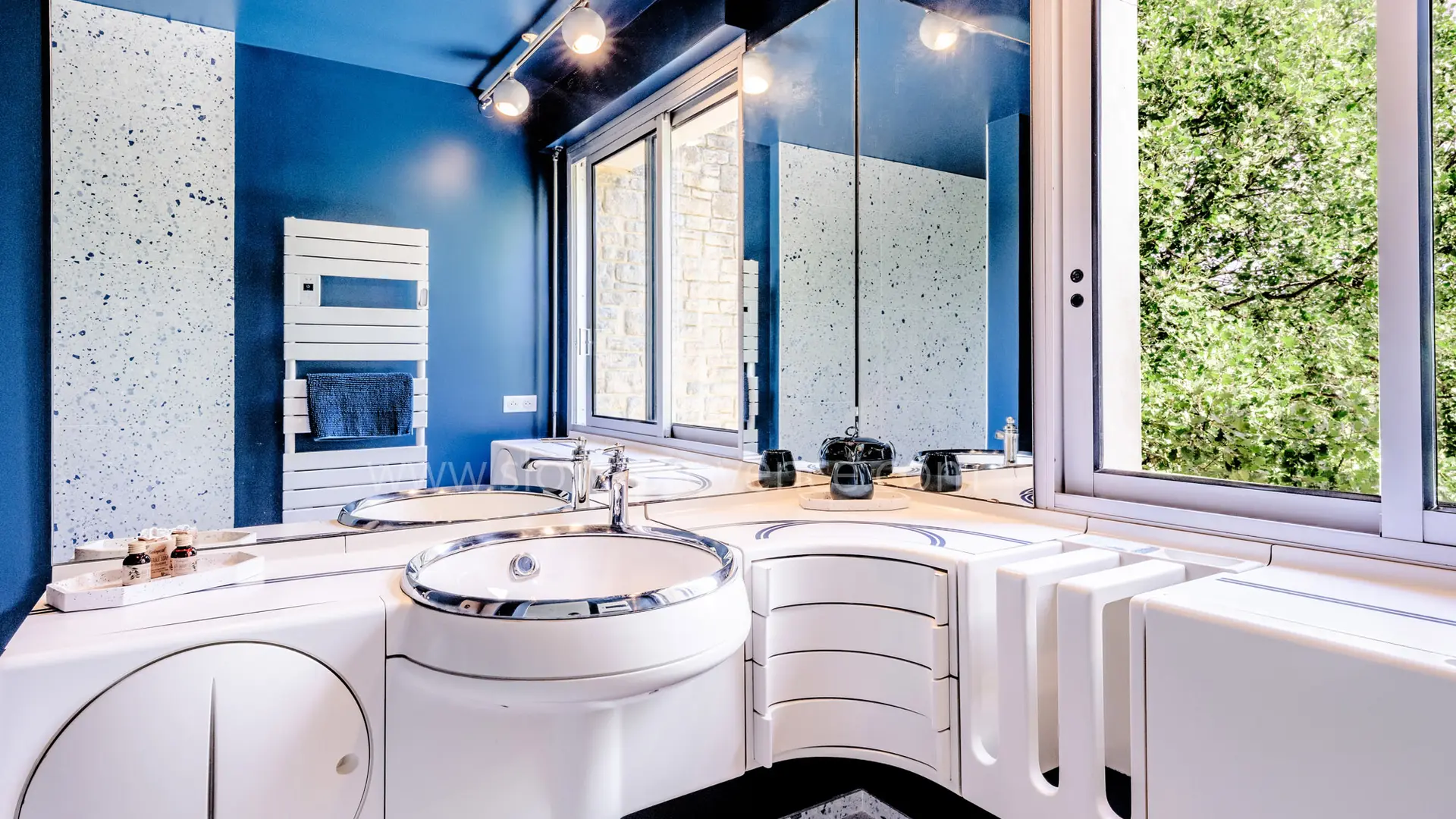 Privates Badezimmer mit Dusche, auch hier wieder mit spektakulärem Design aus den 70er Jahren, das im Originalzustand erhalten geblieben ist und sicher kleine (und große!) Gäste begeistern wird.