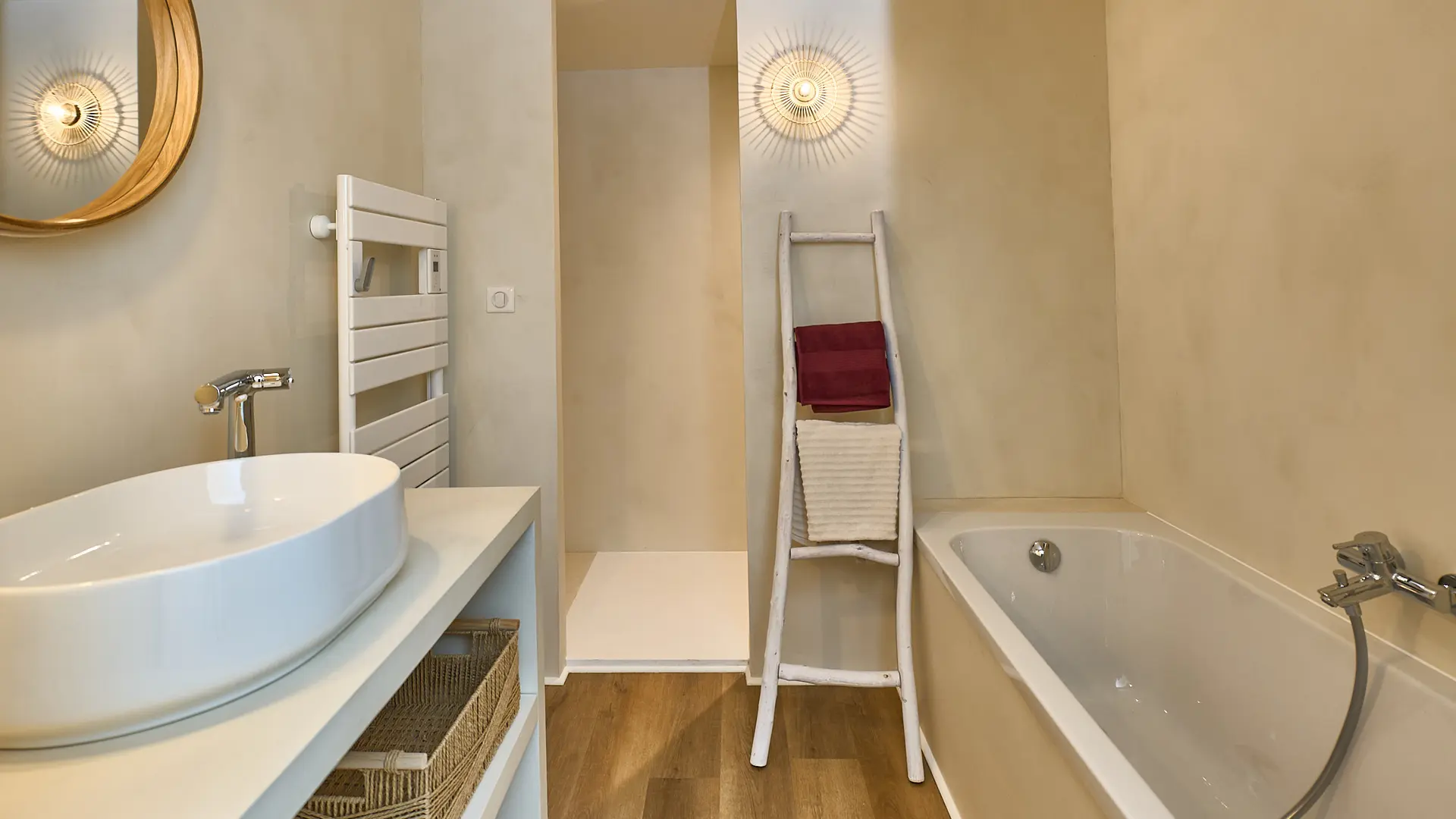 Eigenes Badezimmer mit einer begehbaren Dusche und 1 Badewanne sowie einem Waschbecken.