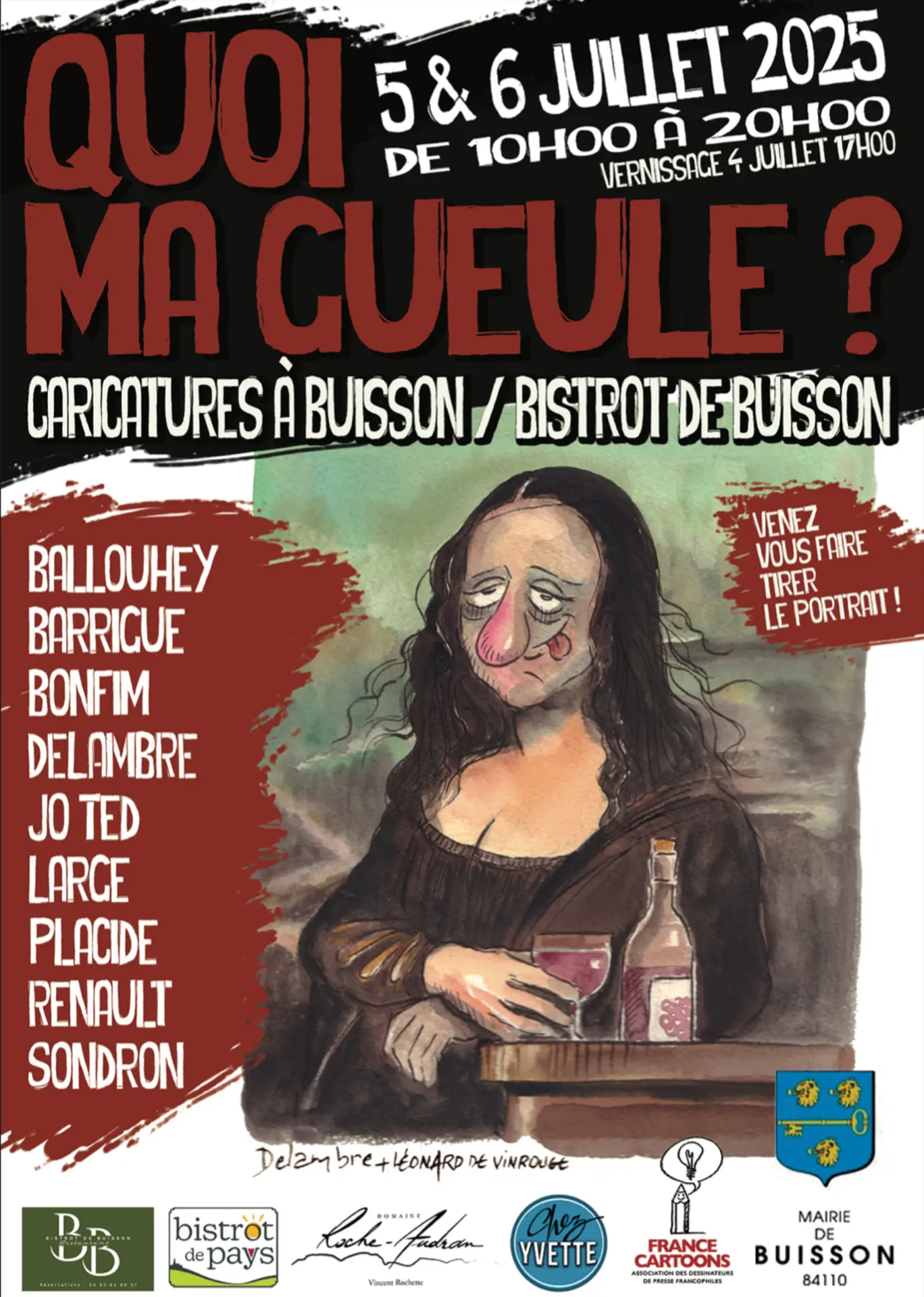 Und um das Erlebnis abzurunden, wird das Weingut La Roche-Audran eine spezielle Cuvée anbieten, deren Etiketten von drei teilnehmenden Karikaturisten illustriert wurden. Das Ganze kann auf der Terrasse des Bistrot de Buisson in einer geselligen Atmosphäre genossen werden.